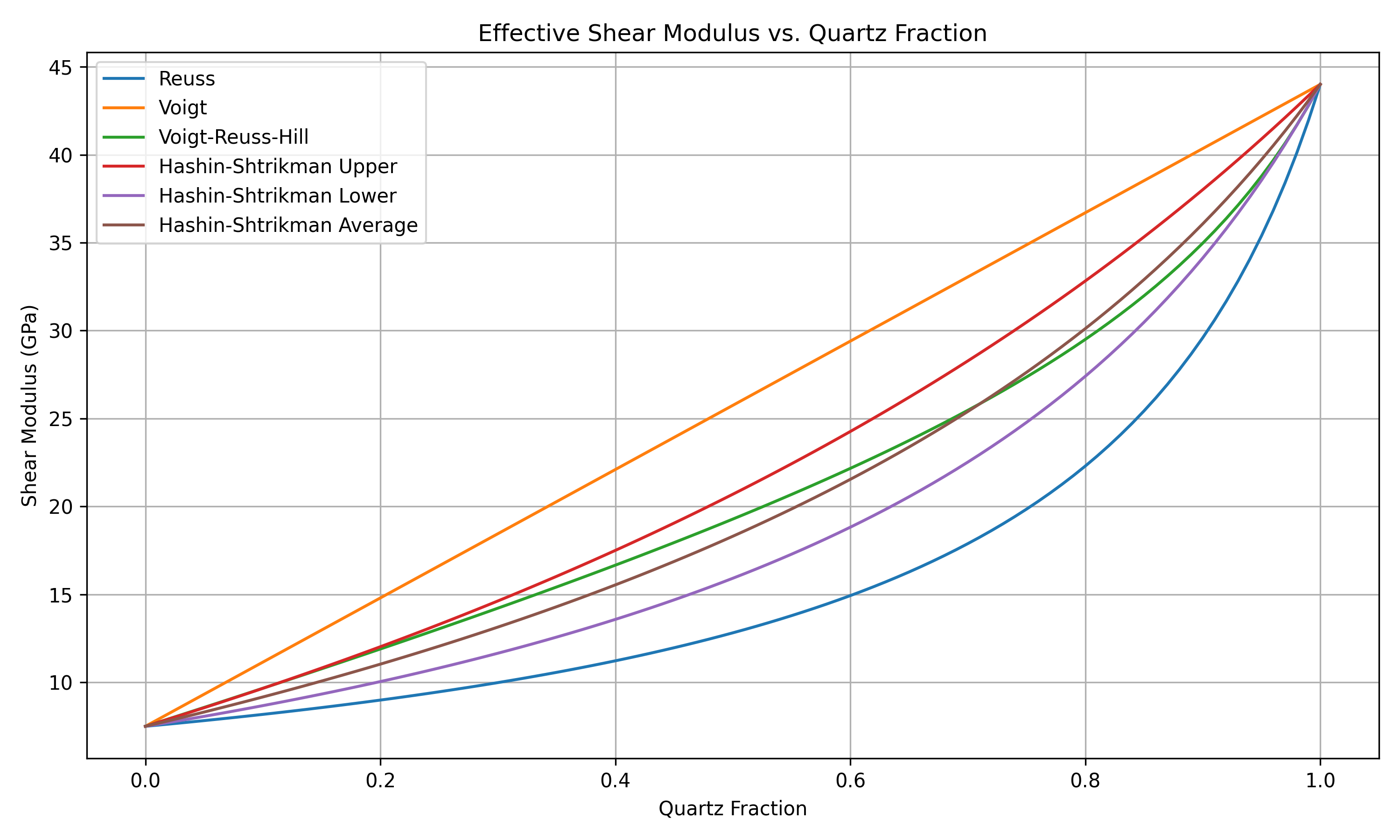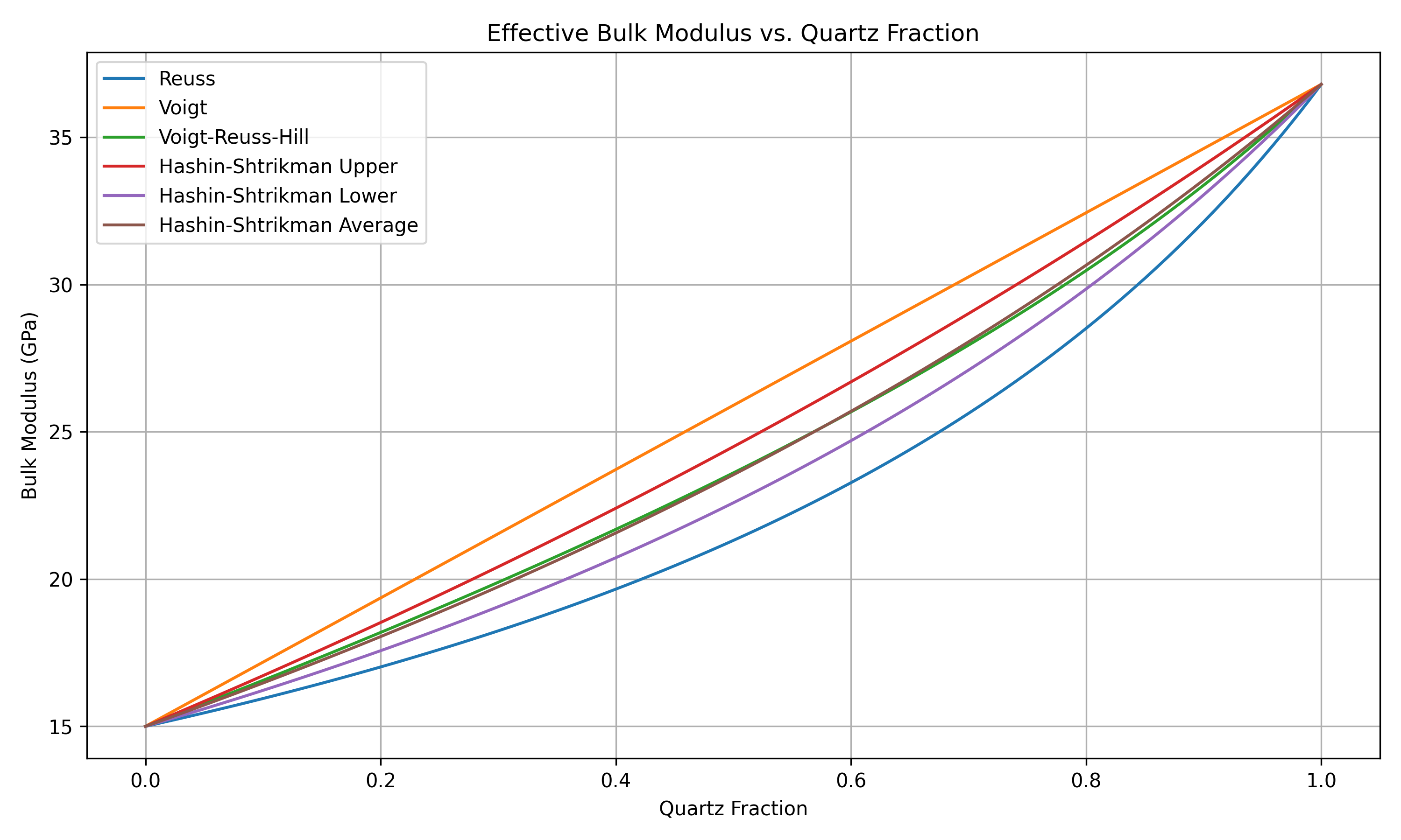 : Hashin-Shtrikman and Voigt-Reuss-Hill average. The difference between them is illustrated in Figure 1 and Figure 2 below. In this example, quartz is mixed with a soft marine clay in different proportions. As shown, there is negligible difference in effective bulk modulus properties when selecting either Hashin-Shtrikman average or Voigt-Reuss-Hill average. The upper and lower bounds of both methods are also included in the plots. The bounds for Hashin-Shtrikman are notably narrower than for Voigt and Reuss bounds, with the latter representing the stiffest and softest theoretical combinations, respectively.