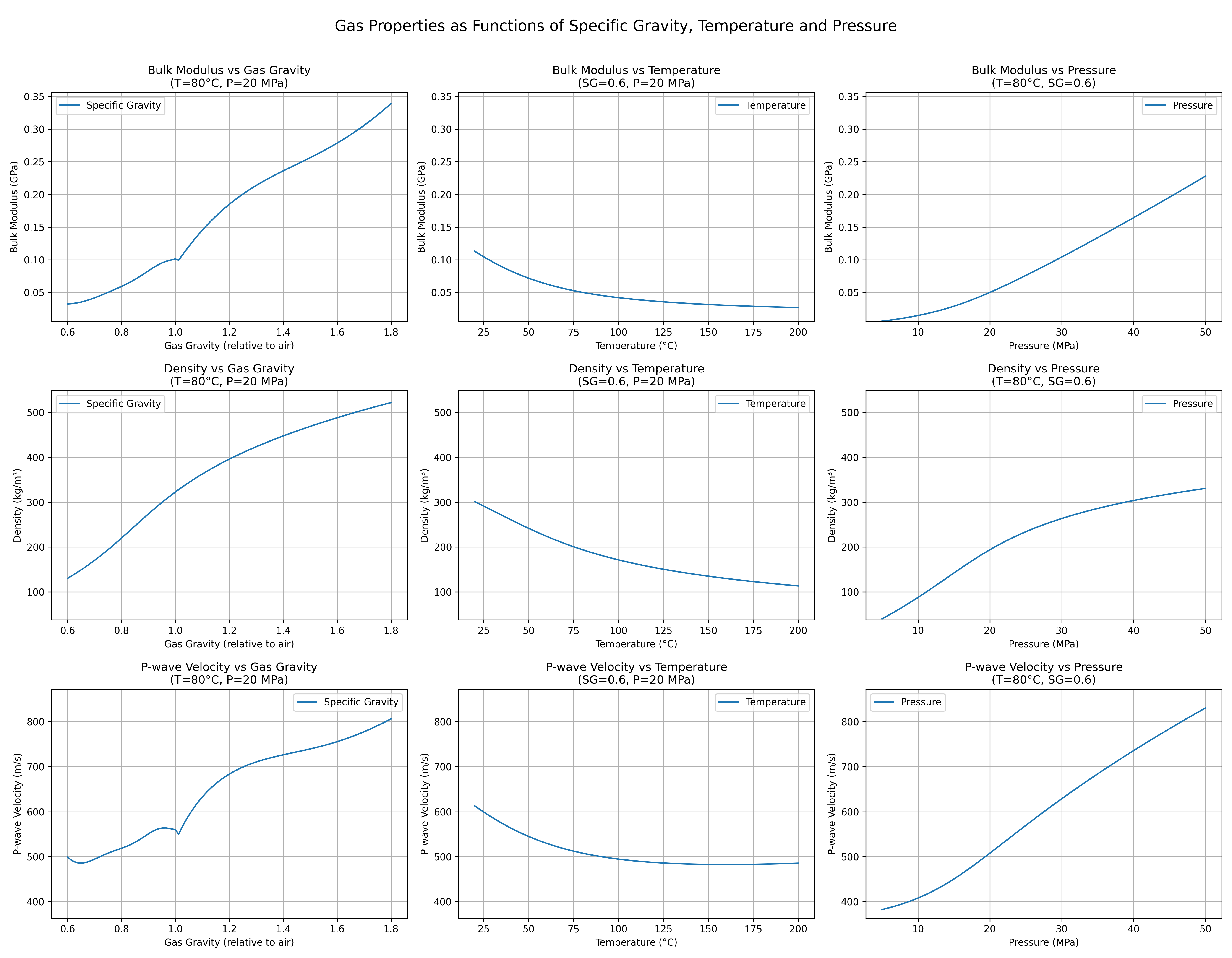 Unlike mineral properties, the elastic properties of each fluid phase are not constants. They vary with temperature and pressure, as well as other parameters, listed in Table 1 below. Pressure in terms of fluid modelling is synonymous with formation pressure.