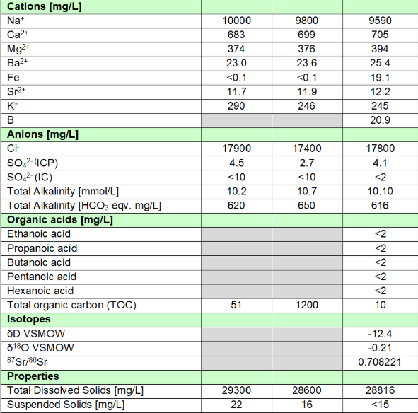 As listed in Table 1, salinity and composition of different salts are required for modelling of brine properties, in addition to pressure and temperature. Note that the brine model assumes single-phase behaviour, i.e. it is not a model for steam, nor ice. Values for salinity and composition are taken from isotope analysis reports. An example is shown in Figure 1. The values we require here are total dissolved solids, Na⁺, Ca²⁺ and K⁺. All are given here in unit mg/L, which is equivalent to ppm, i.e., the expected unit for salinity. Calculating the percentage of Na, Ca and K should be straightforward, as they have the same unit. Variation in composition has much less influence on the elastic properties than salinity, temperature and pressure; see Figure 2.