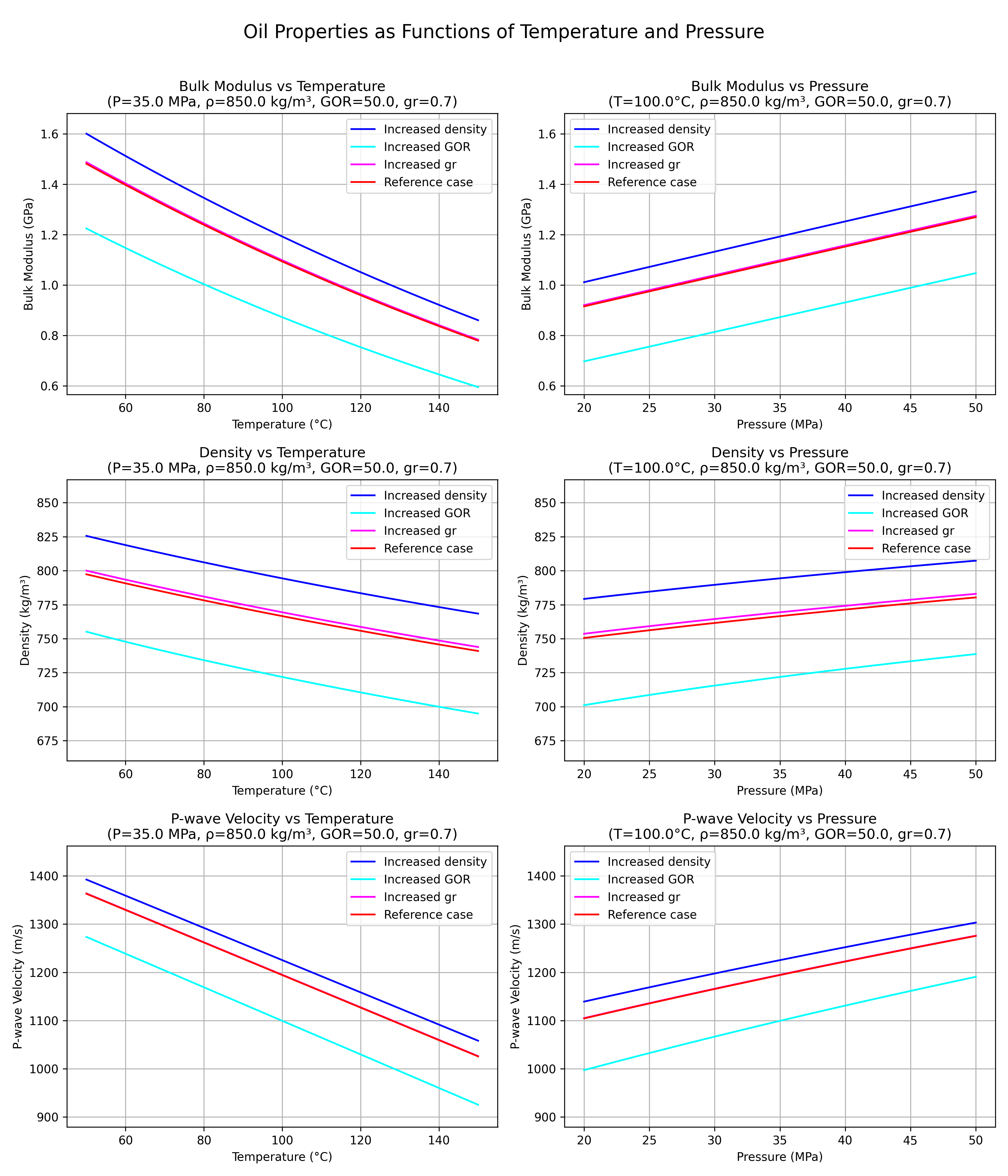 . Oil with an API gravity as low as 10° can be modelled with the standard oil model, unless the temperature is very low. Oil properties as functions of temperature and pressure are shown in Figure 4. The other parameters are shown with one reference case, and comparison cases where each parameter is increased, one at a time.