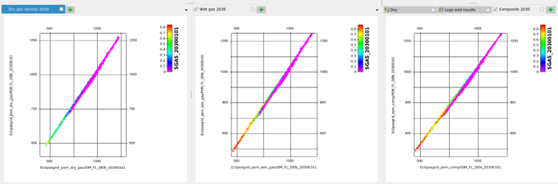 Figure 1: Estimate of fluid density from simulator model (x-axis) and PEM (y-axis) for a selected time step. With settings for either dry gas, wet gas or a compositional model, simulator model and PEM are in agreement.