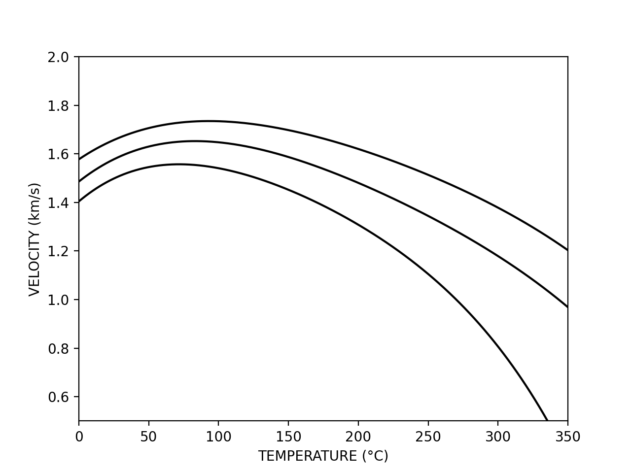 The velocity of water is shown in figure 12 of Batzle and Wang. Here the calculated values from their equations and that of the figure differ quite a bit for 200MPa as the values in the figure are likely from experiment. We can still show how the calculated values fair: