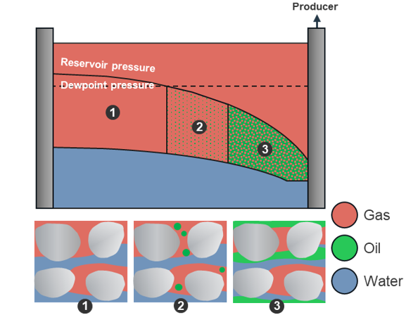 This field scenario is for a three-phase reservoir simulation allowing for condensate dropout (oil displacing gas) in addition to water displacing both gas and oil. The figure below illustrates different regions and processes in a wet gas/condensate field.